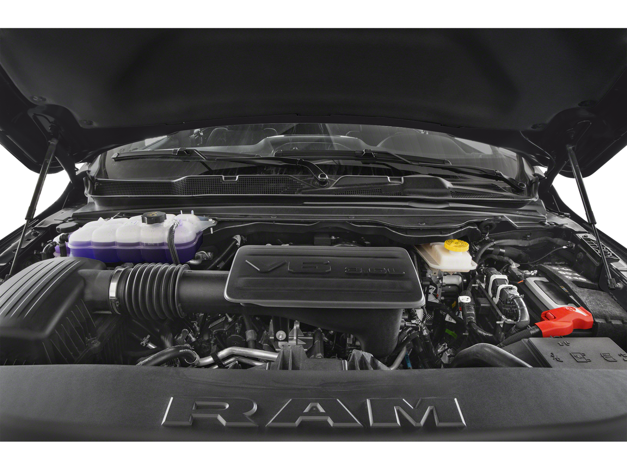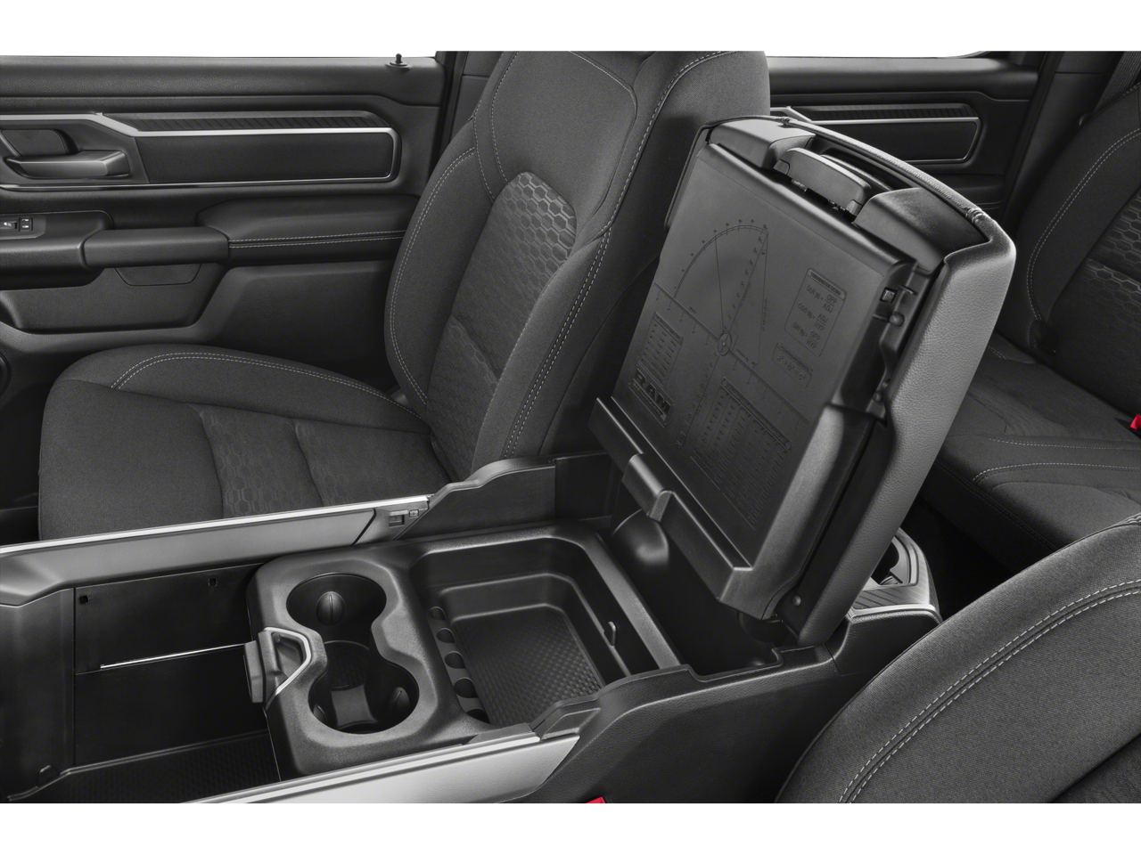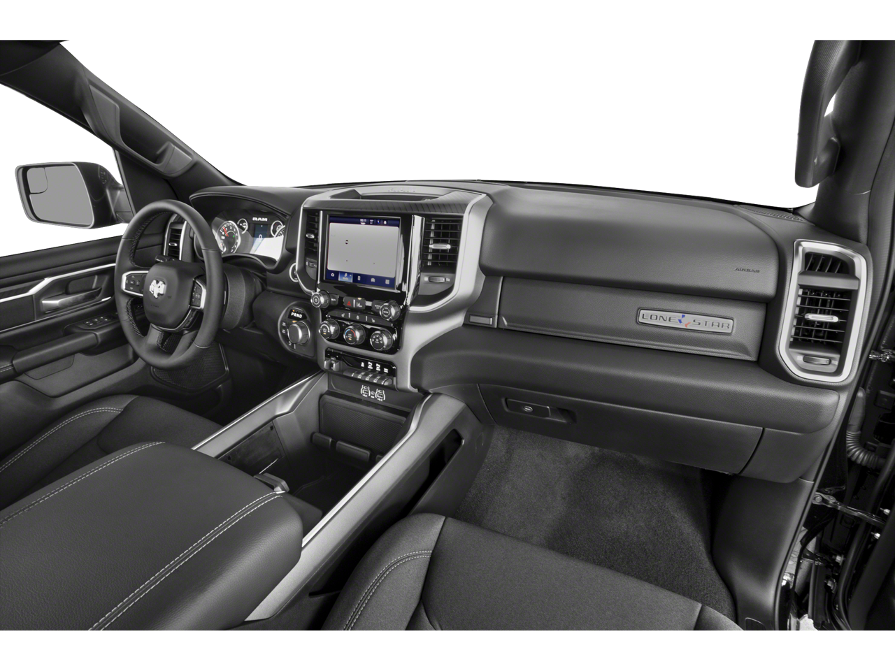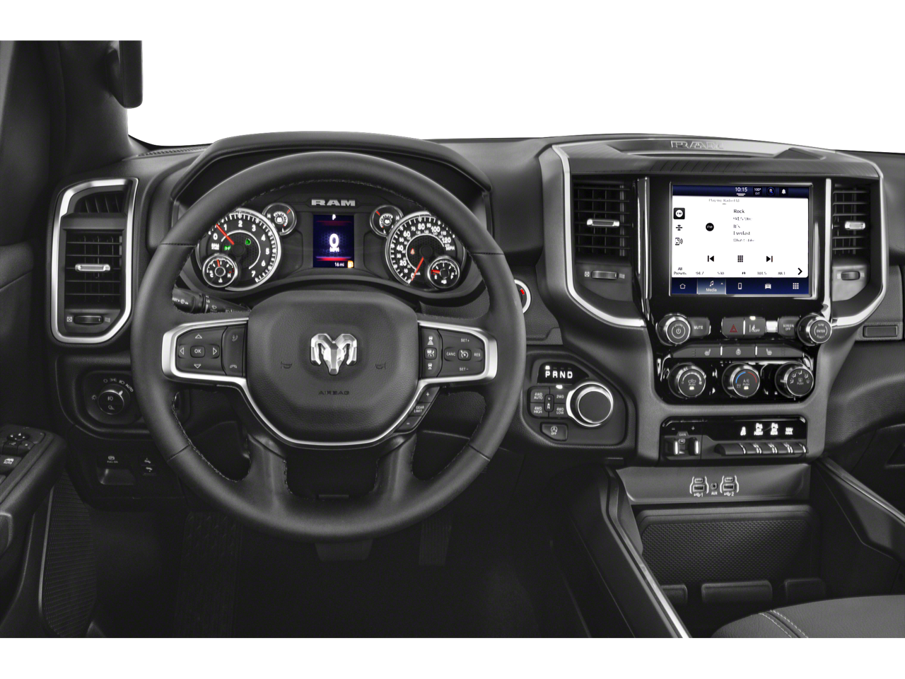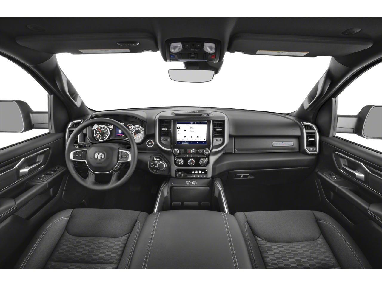 115V Auxiliary Power Outlet, 115V Auxiliary Rear Power Outlet, 12 Touchscreen Display, 2nd Row In Floor Storage Bins, 3 Rear Seat Head Restraints, 4 Way Front Headrests, 400W Inverter, 4G LTE Wi-Fi Hot Spot, 9 Amplified Speakers w/Subwoofer, Accent Color Door Handles, Accent Color Premium Power Mirrors, Accent Color Tailgate Handle, Air Conditioning ATC w/Dual Zone Control, Anti-Spin Differential Rear Axle, Apple CarPlay, Auto Power-Folding Mirrors, Auto-Dimming Exterior Driver Mirror, Auto-Dimming Rear-View Mirror, Bed Utility Group, Big Horn Level 2 Equipment Group, Black Exterior Mirrors, Black Exterior Truck Badging, Black Headlamp Bezels, Black Interior Accents, Black Painted Exterior Mirrors Caps, Black Premium Power Mirrors, Black Tail Lamp Bezels, Body Color Front Bumper, Body Color Rear Bumper w/Step Pads, Bucket Seats, Cluster 7.0 TFT Color Display, Configurable Drive Mode, Connected Travel & Traffic Services, Connectivity - US/Canada, Convex Wide-Angle Exterior Mirror Insert, Deluxe Cloth Bucket Seats, Exterior 115V AC Outlet, Exterior Mirrors Courtesy Lamps, Exterior Mirrors w/Heating Element, Exterior Mirrors w/Supplemental Signals, Front fog lights, Front Seat Back Map Pockets, Full Length Floor Console, Glove Box Lamp, Google Android Auto, GPS Antenna Input, GPS Navigation, Grille Black Surround Black Mesh, HD Radio, Heated Front Seats, Heated Steering Wheel, Integrated Voice Command w/Bluetooth®, Leather Wrapped Steering Wheel, LED Dome Lamp w/On/Off Switch, LED Footwell Lighting, Manual Adjust 4-Way Front Passenger Seat, Media Hub w/2 Charge Only USBs, MOPAR 4 Adjustable Cargo Tie-Down Hooks, MOPAR Front & Rear Rubber Floor Mats, MOPAR Spray In Bedliner, Night Edition, Overhead LED Lamps, ParkView Rear Back-Up Camera, Pick-Up Box Lighting, Power 2-Way Driver Lumbar Adjust, Power Adjust 8-Way Driver Seat, Power Adjustable Pedals, Premium Overhead Console, Protection Group, Quick Order Package 21Z Big Horn, Radio: Uconnect 5 Nav w/12.0 Display, RAM Grille Badge - Black, Rear 60/40 Folding Seat, Rear Center Armrest, Rear Power Sliding Window, Rear Window Defroster, Remote Tailgate Release, Security Alarm, SiriusXM w/360L, Steering Wheel Mounted Audio Controls, Sun Visors w/Illuminated Vanity Mirrors, Tow Hooks, Trailer Brake Control, Universal Garage Door Opener, USB Host Flip, Wheels: 20 x 9.0 Aluminum Painted Clad.